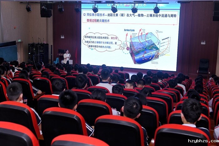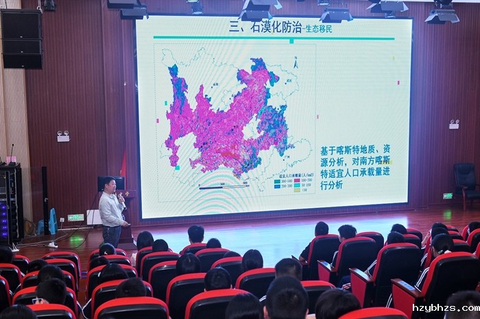 在怀化市金时中学,袁红朝正高级工程师作题为《双刃剑:小小元素的大能量》的科普报告,元素作为物质的基本单位,其微观能量既可推动文明,也可能引发危机作为,报告还回顾一批杰出科学家以爱国奉献、自主创新精神,助力中国核能事业崛起的故事;张浩研究员作题为《石漠化:土地的“石化”之谜与绿色复苏计划》的报告,介绍了我国南方石漠化分布情况及危害,剖析自然与社会成因,并从生态移民、植被复合经营、生态产业等方面展示石漠化治理成效。
