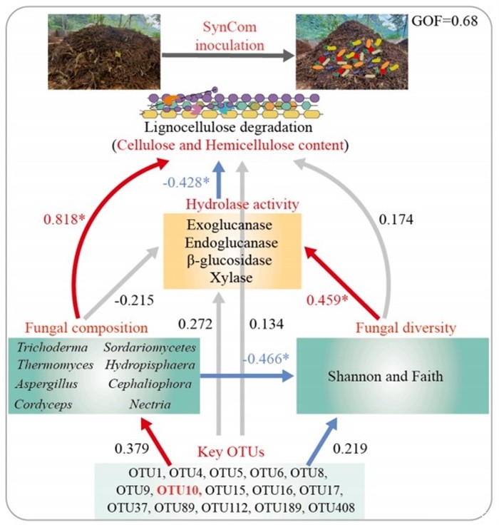 其次,合成菌群通过调控真菌群落进一步强化堆肥物质转化。研究发现,SynCom接种提高了Cephaliophora、Thermomyces等关键真菌属的相对丰度,并显著增加了与木质纤维素降解密切相关的功能类群,如木材腐生菌、未定义的腐生菌以及凋落物腐生菌的活性。此外,关键物种Hydropisphaera(OTU10)的显著富集被证实为降解木质纤维素的重要驱动因子,显著提升了堆肥后成熟期的有机肥质量。该研究成果发表于Bioresource Techonology期刊,第一作者为刘秋梅,标题为Synthetic microbial community enhances lignocellulose degradation during composting by assembling fungal communities(图2)。
