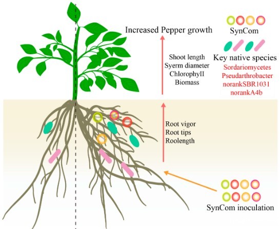 此外,该团队进一步探索了合成菌群在促进辣椒生长上的应用。合成菌群接种显著提高了辣椒植株的株高、茎粗、叶片数量、叶绿素含量及根系活力。高通量测序结果显示,接种合成菌群显著增加了根际微生物群落的丰富度和关键菌属的丰度,尤其是Sordariomycetes和Pseudarthrobacter的相对丰度与作物生长密切相关。这一研究已发表在Microorganisms期刊,共同一作为游甜、刘秋梅,标题为Synthetic microbial communities enhance pepper growth and root morphology by regulating rhizosphere microbial communities(图3)。